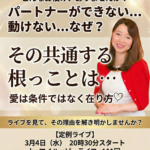 3月4日(水)20時30分~の定例ライブ(by マイハッピーライフ 111回)は──「パートナーができない理由と、動けない理由〜愛は条件ではなく在り方〜」ぜひご覧ください。